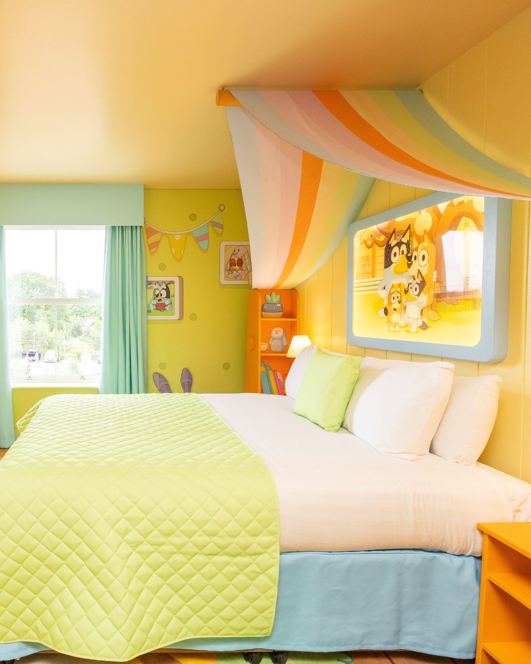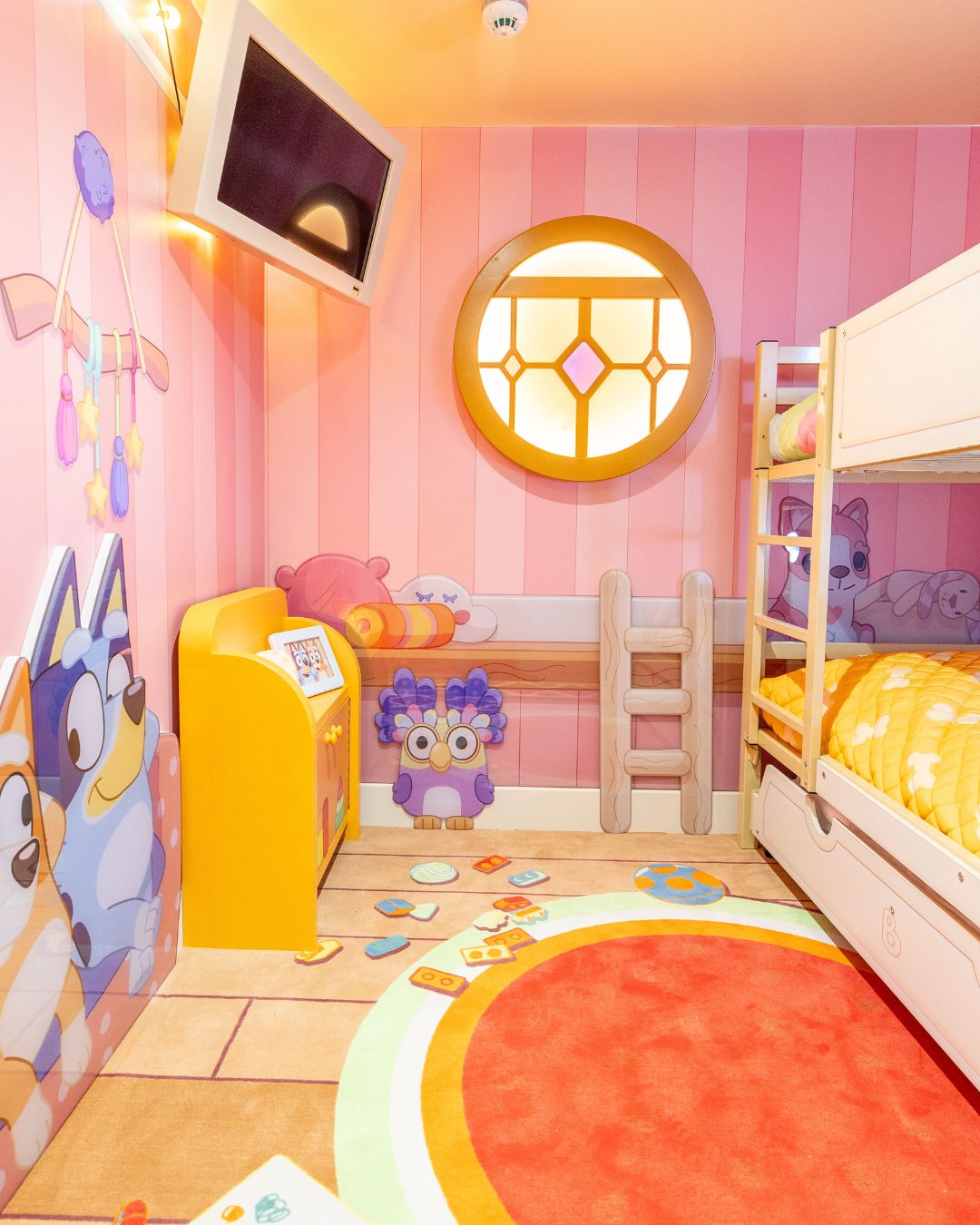 Para uma experiência ainda mais imersiva, há também quartos temáticos dedicados à série no CBeebies Land Hotel. A chamada Bluey Room and Suite foi pensada para famílias até cinco pessoas e recria o universo da personagem, com um quarto infantil temático para as crianças e áreas separadas para adultos. Os preços começam nas £377 por noite (aproximadamente 440€).