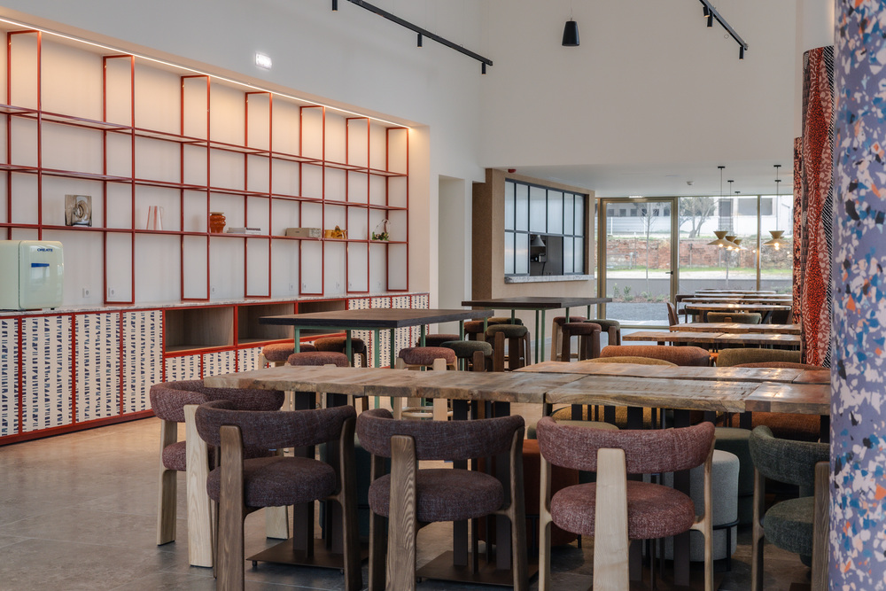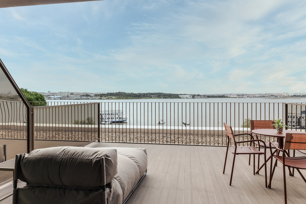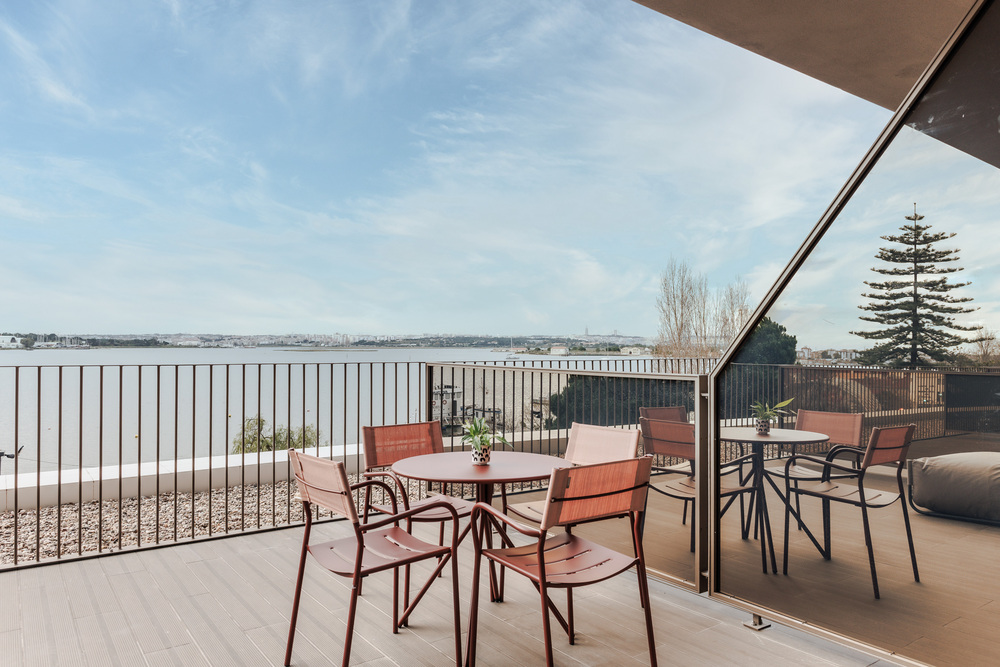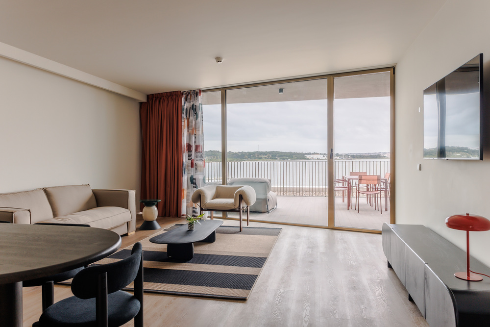 O design industrial é complementado por uma piscina panorâmica e bar no rooftop, ginásio e sauna, espaços para reuniões e eventos, e pelo restaurante Ebulição, onde os sabores do mar são reinterpretados com um toque contemporâneo. Cada detalhe do hotel homenageia a herança local, oferecendo uma experiência que funde passado e futuro à beira do Tejo.