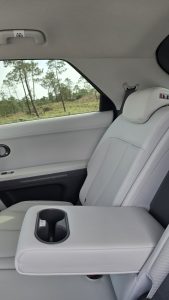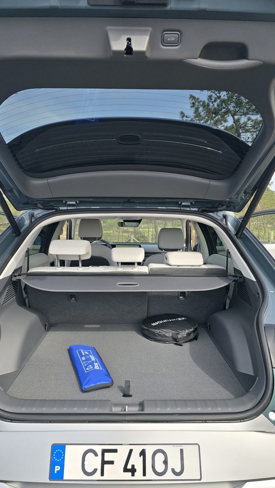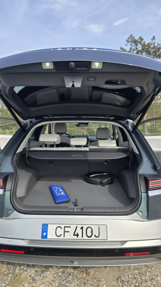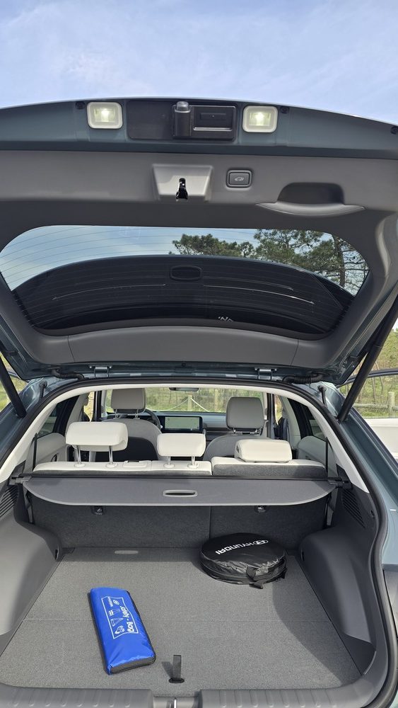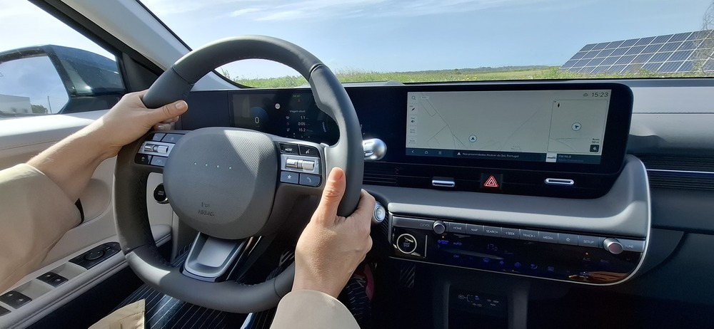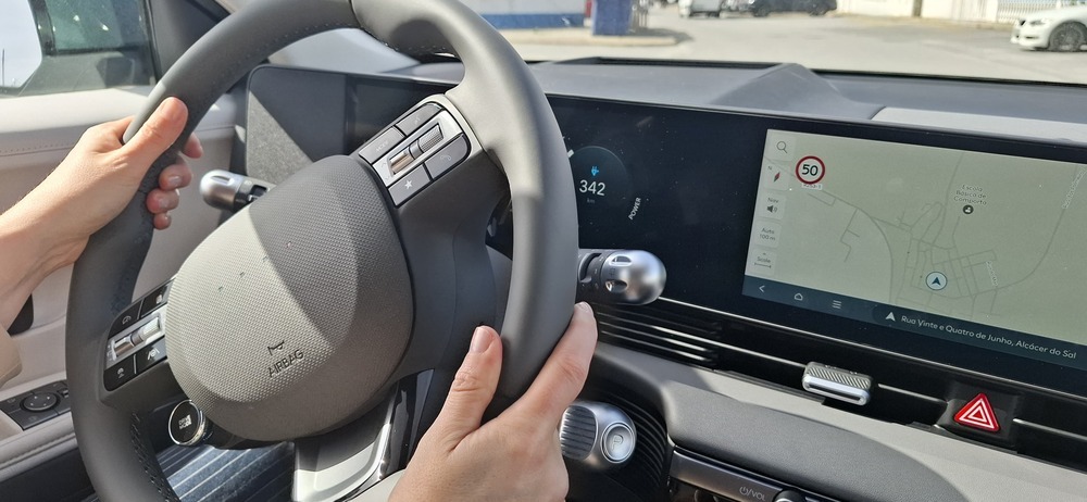 Quem, como eu, está habituado a carros mais pequenos e baixos sente, por norma, mais instabilidade em estrada aberta. Mas o IONIQ 5, mesmo com dimensões generosas, transmite segurança e conforto. A distância entre eixos longa (3 metros) e a plataforma elétrica dedicada ajudam a manter o carro “colado” à estrada, mesmo com vento forte. A isto junta-se uma suspensão afinada para equilíbrio entre conforto e controlo, além de sistemas de assistência à condução que ajudam a manter a trajetória.