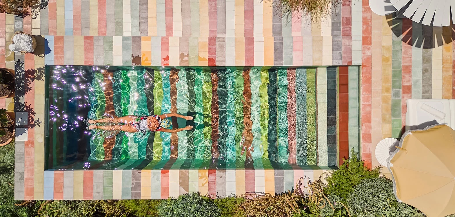 A decoração junta clássicos do design com peças portuguesas vintage, tecidos texturados, iluminação de autor e obras da mãe de Filipa — criando uma atmosfera entre o excêntrico e o sofisticado. O jardim interior, com árvores de citrinos e a tal piscina com riscas, é o coração da casa. É lá que acontecem os pequenos-almoços, os jantares inspirados nas viagens dos donos e as conversas de fim de tarde. Há um honesty bar, pratos pequenos com ingredientes biológicos, e uma mesa desenhada por Daciano da Costa, um ícone do design português.